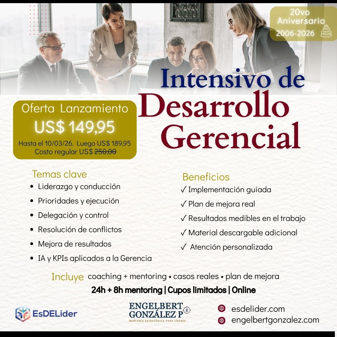 Entrenamiento Intensivo de Desarrollo Gerencial (32 horas): 24h de formación aplicada + 8h de coaching/mentoring grupal para implementar herramientas reales. Ideal para dueños, emprendedores, nuevos gerentes y gerentes empíricos que buscan evitar las crisis e instalar una cultura de eficiencia operativa. Ordena tu gestión, lidera mejor y logra resultados medibles con KPIs, delegación, desempeño y comunicación efectiva.
