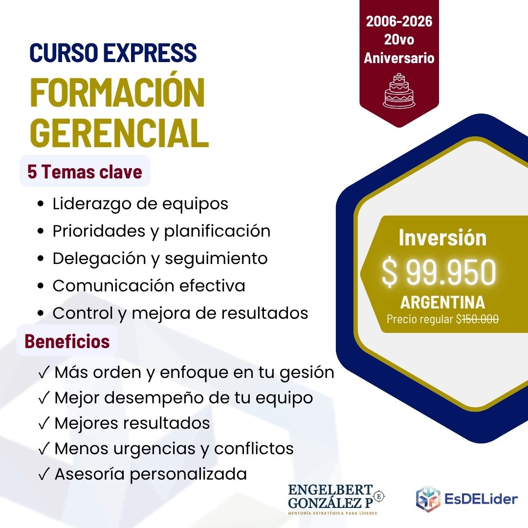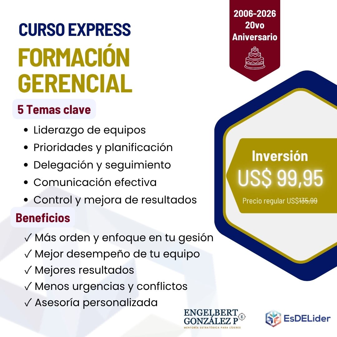 El curso Express Formación Gerencial cubre temas altamente necesarios para el desarrollo de habilidades gerenciales y el desempeño de funciones clave, como la planificación estratégica, liderazgo, delegación eficaz, toma de decisiones, gestión del cambio, trabajo en equipo, entre otros.